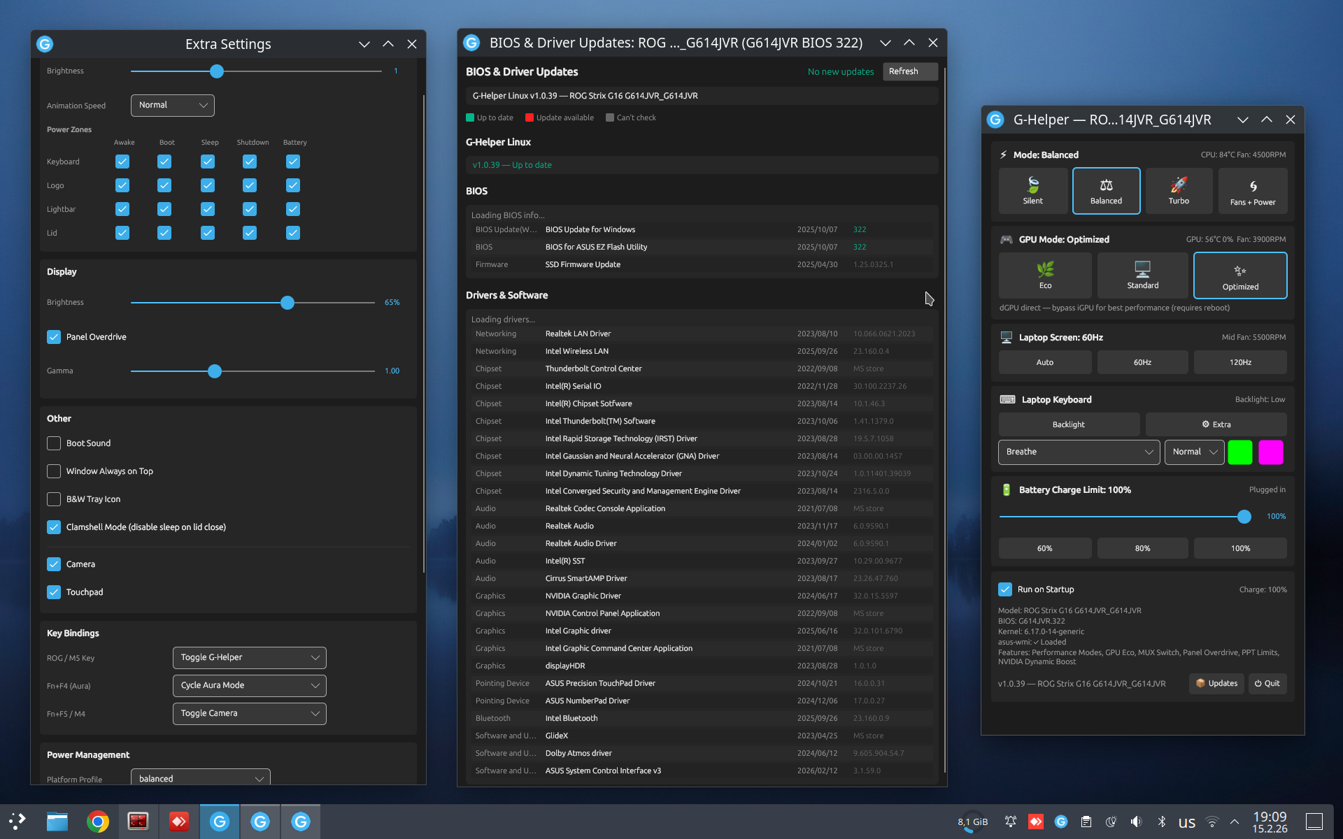 $ curl -sL https://raw.githubusercontent.com/utajum/g-helper-linux/master/install/install.sh | sudo bash Small and lightweight Armoury Crate alternative for Asus laptops on Linux, offering almost the same functionality with a much smaller footprint. A port of the original G-Helper for Windows.